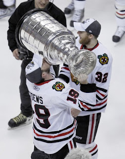 Conn Smythe winner Jonathan Toews hoists the Cup, the Blackhawks’ first since 1961. (Photo courtesy of Chicago Tribune)